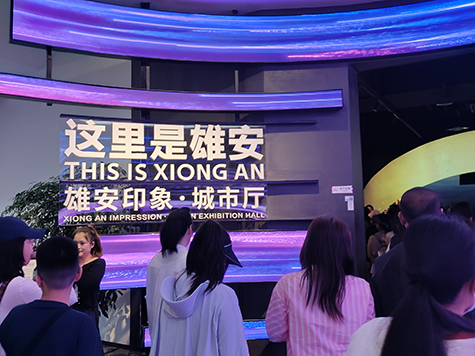 之后我們到達了雄安印象展館,展館中展示著雄安新區(qū)的規(guī)劃設(shè)想,穿越“時光隧道”,沉浸式影像讓大家身臨其境,感受到了新區(qū)從無到有的變化。